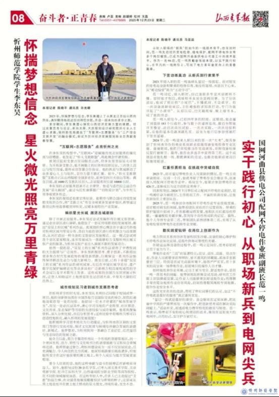 12月23日,《山西青年报》以“忻州师范学院学生李东昊:怀揣梦想信念 星火微光照亮万里青绿”为题,深度报道了我系地本2204班学生李东昊在矢志奉献、服务地方中成长成才的动人故事,生动呈现了新时代忻师学子将个人理想融入党和国家事业中的青春担当。内容如下: