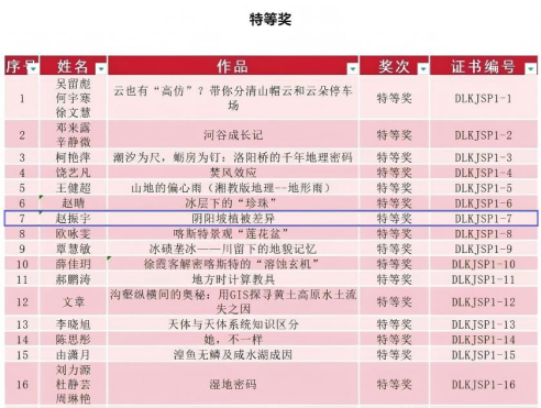 近日,由《中学地理教学参考》编辑部主办的第一届地理科教微视频创作大赛评审结果揭晓。我系地理科学专业2303班学生赵振宇凭借作品《阴阳坡植被差异》,从全国1400余份参赛作品中脱颖而出,荣获特等奖。